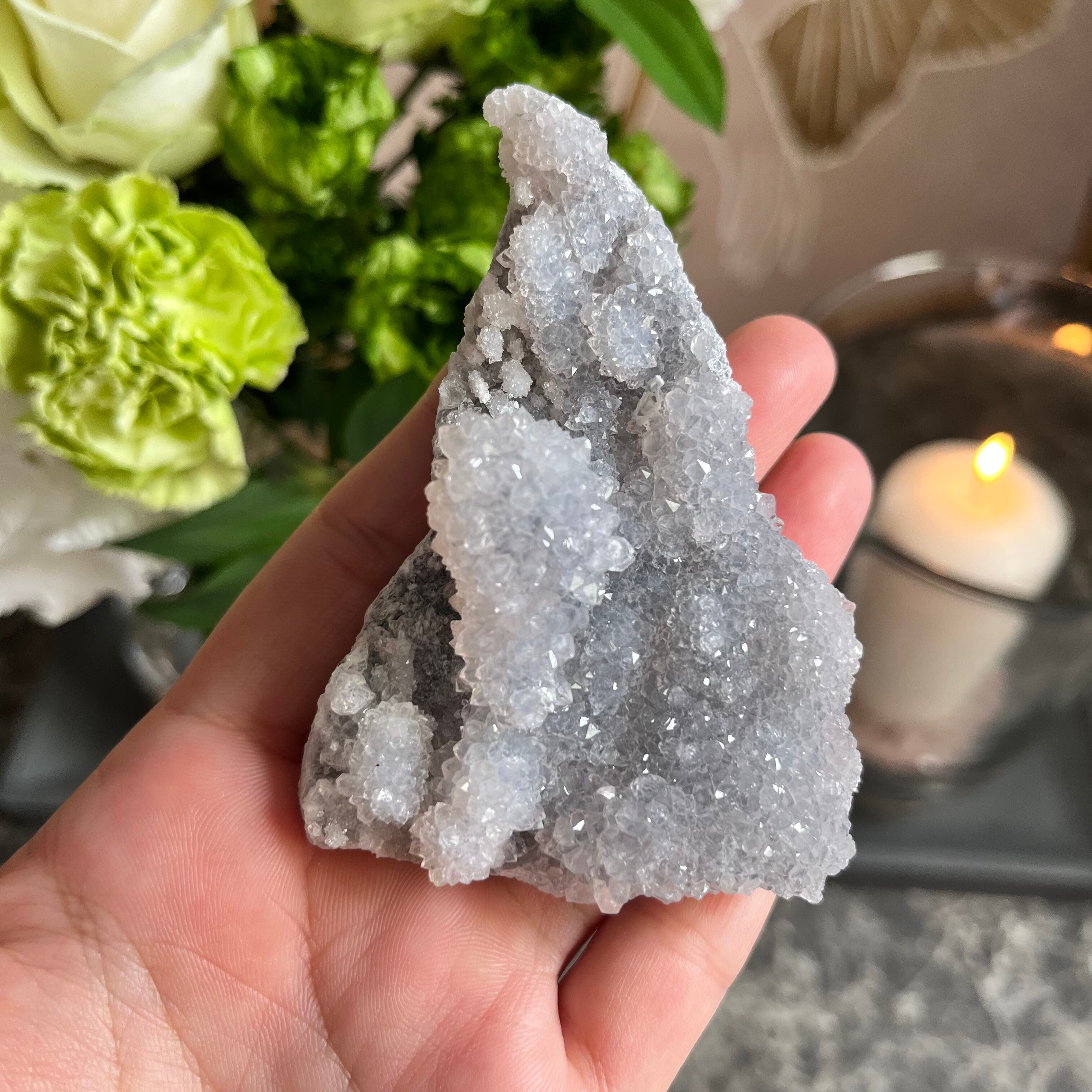 そんな中、今回はとても珍しい「ブラジル産」のものを厳選して入手することができました。この新種ゼオライトたちは、アメジストが採れる鉱山ポケットのすぐ近くのポケットから採れるものになっており、その姿がフラワーアメジストのような雰囲気をもつものも多数あります。その為、「ギャラクシーアメジスト」「フラワーアメジスト」などの流通名で呼ばれていたりまします。